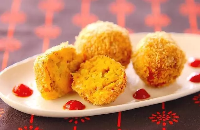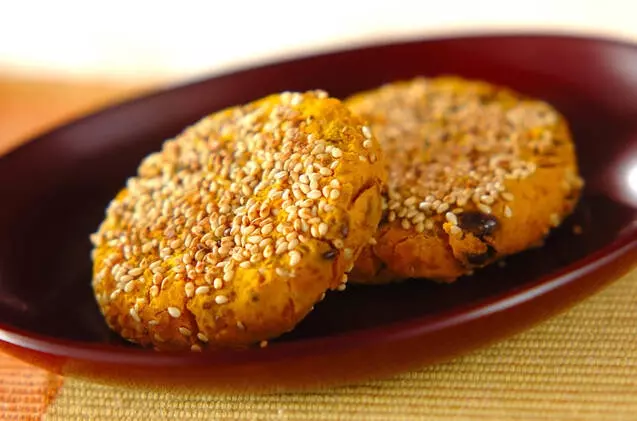 マッシュしたカボチャを丸めてフライパンで焼き上げました。栄養価の高いゴマをたっぷりつけて焼いてください。おやつに最適です。