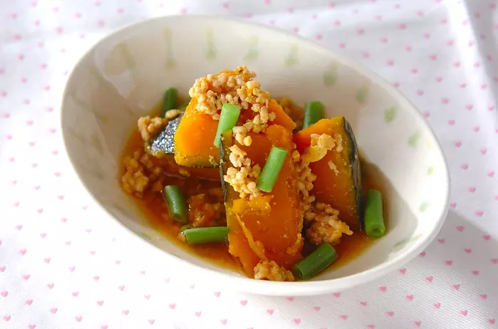 カボチャを鶏ひき肉と一緒にコトコト煮込んだ優しい煮物。カボチャが煮崩れないよう中火でゆっくり炊きましょう。