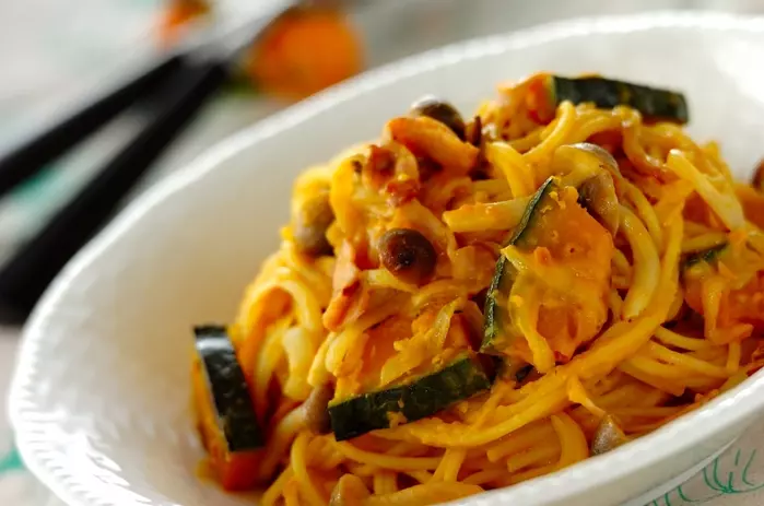 牛乳+カボチャのソースはほんのり甘く優しい味わい。ベーコンやチーズの塩気がアクセントになっています。ハロウィンパーティーにオススメですよ。