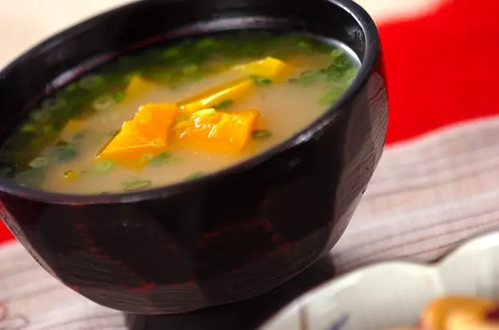 カボチャとネギのシンプルなおみそ汁はホッと心安らぐ美味しさです。カボチャは小さめの一口大に切りましょう。