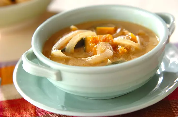 豆乳のやさしい甘さと、カボチャのホクホクとした食感がたまらないスープです。ポタージュとみそ汁のいいとこどりした一品です。