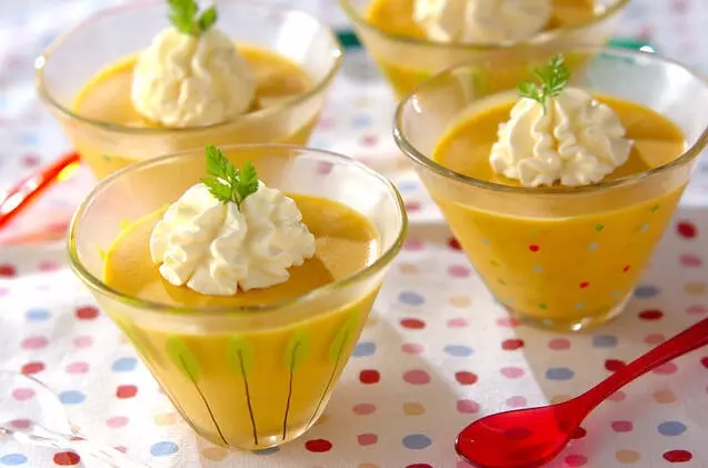ゼラチンで固めるタイプの、濃厚カボチャムースは冷凍カボチャで作るので簡単に作れます!ちょっと甘いものが食べたいときにいかがですか?