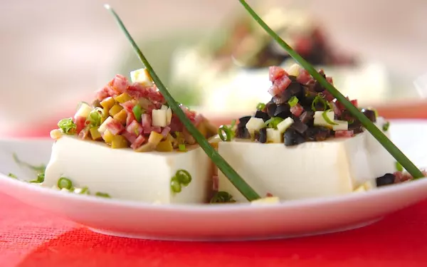 冷奴をイタリアン風にした一品です。豆腐2つのうち、ひとつには緑のオリーブを、残りのひとつには黒オリーブを散らせて、彩り鮮やかに。ワインとのペアリングも◎です。