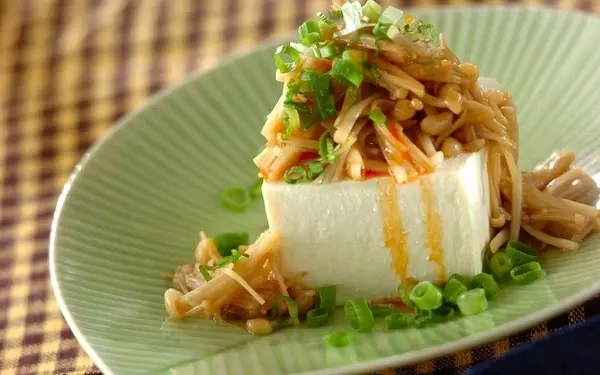 しっかり味のエノキを豆腐にのせると!? いつもとは違う風味の冷奴が完成。細ネギをのせ、ラー油をかけてから召し上がれ。お酒のおつまみとしても最適です。