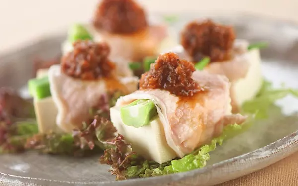 いつもの冷奴に豚シャブを巻いて豪華に! 梅肉でさっぱりとした味わいです。冷酒やビールなどとの相性も良く、暑い季節のベストおつまみになるかもしれません。