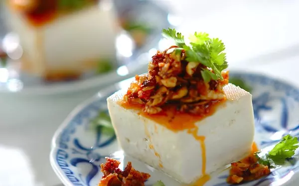 甘さと辛さのバランスが絶妙な冷奴です。手作りの食べるラー油の味は格別。仕上げにお好みで、香菜を飾ってくださいね。食べるラー油はご飯のほか、肉・魚料理とも相性が良いです。