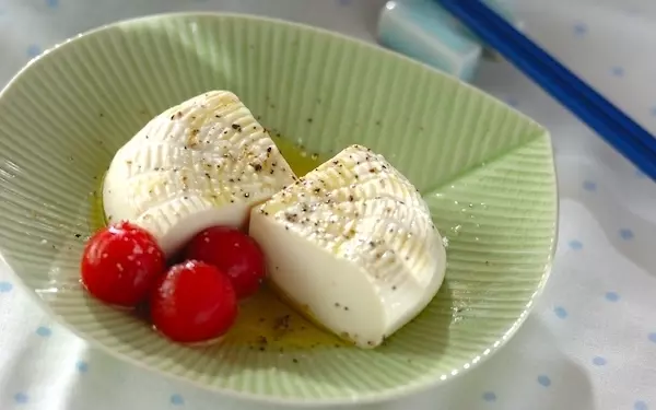 こちらの冷奴は、豆腐、プチトマトを器に盛り、EVオリーブ油をかけて、粗塩、粗びき黒コショウを振れば出来上がりです。オシャレで美味しいのがポイント。プチトマトの湯むきは丁寧に。