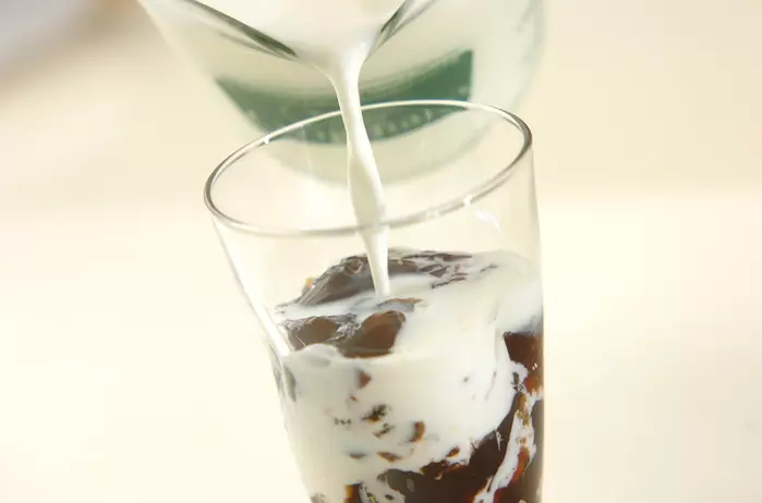 インスタントコーヒーとゼラチンで作ったフルフルのコーヒーゼリーに牛乳を注いで作る飲むタイプのコーヒーゼリー。練乳を入れて甘くしてもよし。テレワークの眠気防止にコーヒーゼリーの量を増やしてもよいですね。
