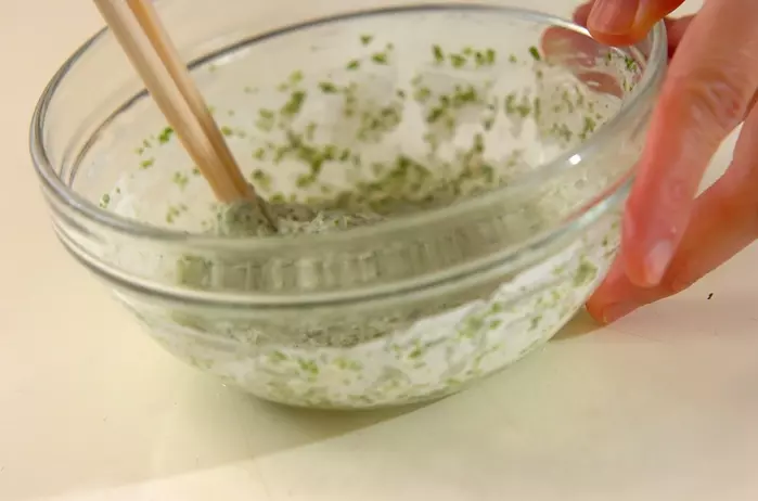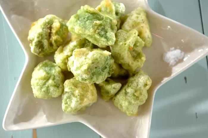 フリット生地に青のりを加えて、ホタテの貝柱やエビを磯部揚げにしました。白ワインにピッタリの地中海風おかずの完成です。ケチャップとマヨネーズを合わせたオーロラソースやビネガーなどソースをアレンジするとさらに楽しいですね。