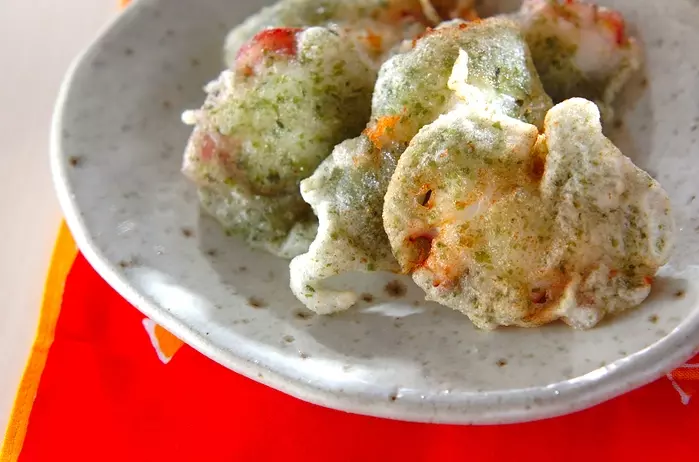 食物繊維豊富なレンコン。青のりの衣に絡めて作るレンコンの磯部揚げは食べ応え満点です。塩を付けてそのまま食べても、うどんやお蕎麦に添えても良いですね。口いっぱいに広がる磯の香りがたまりません。