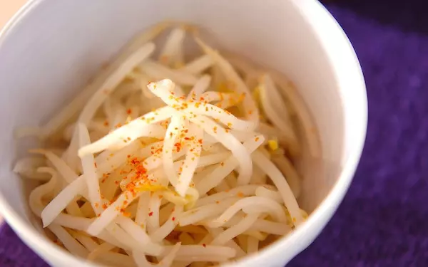 たっぷりの熱湯にモヤシを入れてサッと茹で、ザルに上げてゆで汁を切り、モヤシが熱い間に作り置き甘酢をからめれば完成です。一味唐辛子をかけていただきましょう。お酒のおつまみにもなりそうですね。