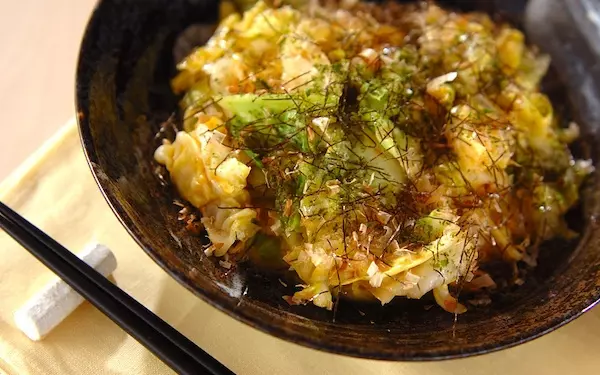 キャベツ2分の1玉を使って作る炒めとじ。キャベツは、炒める前に塩もみをしておくことがポイントです。バターでコクと風味をプラスします。仕上げにお好みで、つお節、刻みのり、青のりを散らしてから召し上がれ!