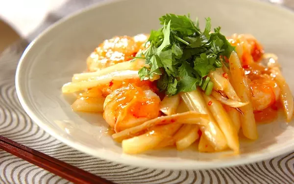 プリプリッとした食感のエビとジャガイモ、白ネギのエスニックな炒め物です。丼にしても美味しくいただけます。最後に散らす香菜は、刻みネギやミツバで代用可能。ピリ辛でほど良い甘味のある一品です。