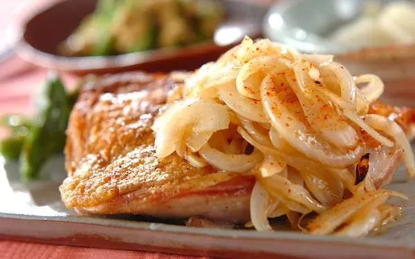 鶏もも肉をカリカリに焼くのが一番のポイントになります。甘酢で炒めた玉ネギをたっぷりかけてから召し上がりください。ジューシーな鶏肉とシャキシャキ食感の玉ネギが、お互いの旨味を引き出し合います。