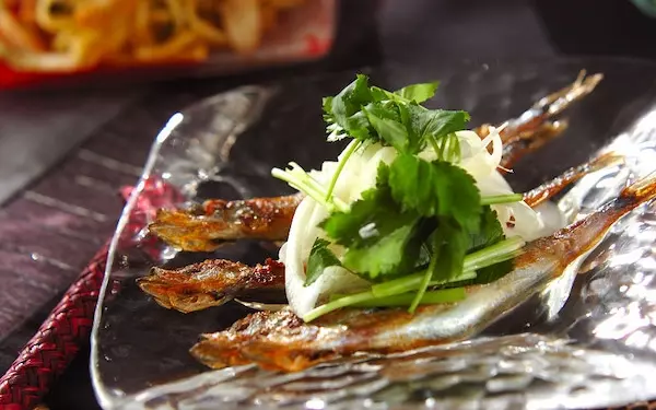 焼いたシシャモに甘酢をからめた玉ネギをたっぷりかけた料理です。仕上げに、ミツバをのせて、彩り良く仕上げましょう。ただ焼くだけのいつものシシャモとは一味も二味も違いますよ。