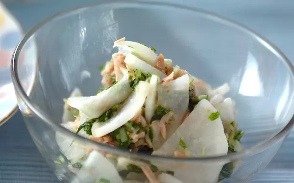 オイル漬けのツナも作り置き甘酢と合わせることで、あっさりとした味わいに。ご飯がもりもり進む美味しさです。大根と水菜、ツナだけで作れるので、時間のないときにもピッタリ。