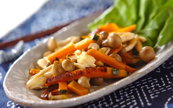 カボチャとシメジの炒め物を甘酢でさっぱりといただけます。具をカットして、炒め合わせ、サラダ菜をしいた器に盛れば出来上がりです。ダイエット中の主菜にもなるお手軽レシピ。ぜひ作ってみてください!