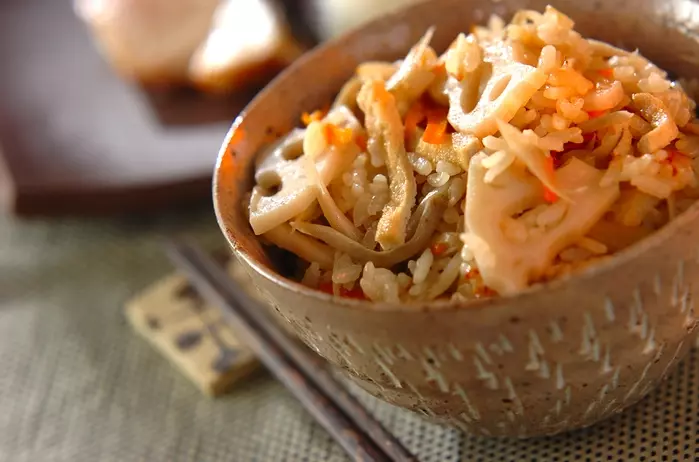 レンコンやゴボウやにんじんなど、たっぷりの根菜類をごま油で炒めてから炊く栄養価の高い炊き込みご飯。市販の根菜類の水煮を使うと簡単にできますよ。