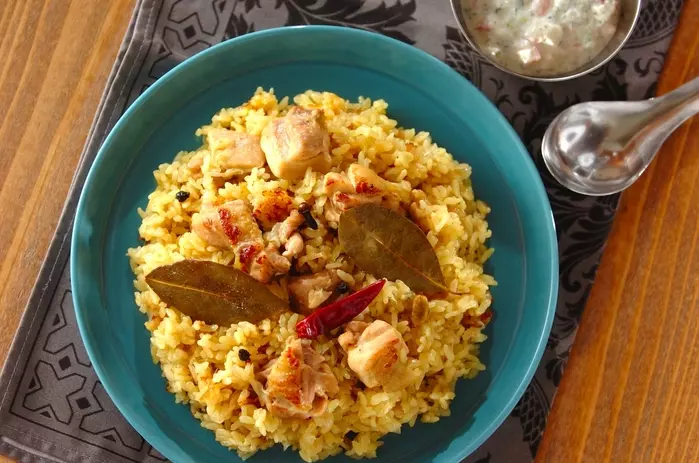 クローブ、カルダモン、ターメリックなど香辛料とチキンの旨味が混ざりあったインドの炊き込みご飯「ビリヤニ」。全てのスパイスが揃わなくてもよいですが、種類が多ければより香りが複雑で味わい深く。。赤唐辛子は割れていない物を使って下さいね。