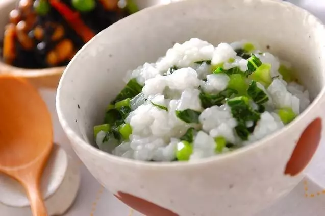 昆布と鶏の出汁で炊き込んだやさしい味わいのおかゆです。土鍋で簡単に作れます。カブの葉がない場合はホウレン草や小松菜等で代用してください。土鍋で炊く際に、途中で水分が少なくなったらお湯を適量足してくださいね。