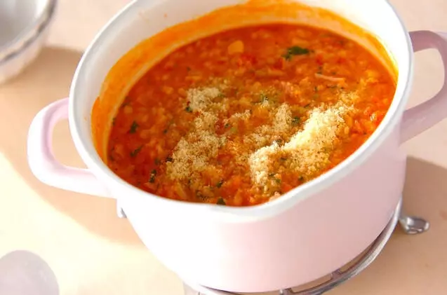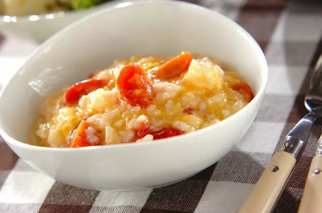 リゾット風の洋風おかゆです。粉チーズをたっぷり振ってコクと香りをプラスしましょう。色鮮やかな、トマトの赤い色の見た目が食欲をそそります。甘みのある雑穀ご飯は、食感も楽しめるのが魅力です。食べ応えのあるお粥です。