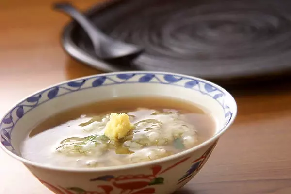 もずくとミツバのシンプルなおかゆをぽってりめに炊いて、黄金色のあんを上からトロリかけました。おろしたショウガと一緒にまぜながら食べると美味しいです。とろみがあるので、旨みもギュッと詰まって、とっても食べやすいのが魅力です。