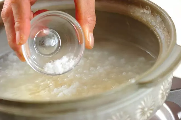2、ふいてきたらトロ火にして40~45分位炊き、火を止めて10分そのまま蒸らす。塩で味を調え、器に盛る。