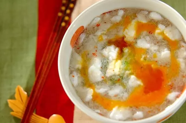 卵白のふわふわっとした食感が楽しいお粥です。七草がゆが苦手な子どもも美味しく食べられそうです。いつもの味に飽きたら、出来上がった七草がゆにカニ缶やスープなどをプラスして、変化を楽しんでください。最後に溶いた卵黄、ゴマ油をたらすのもポイントです。