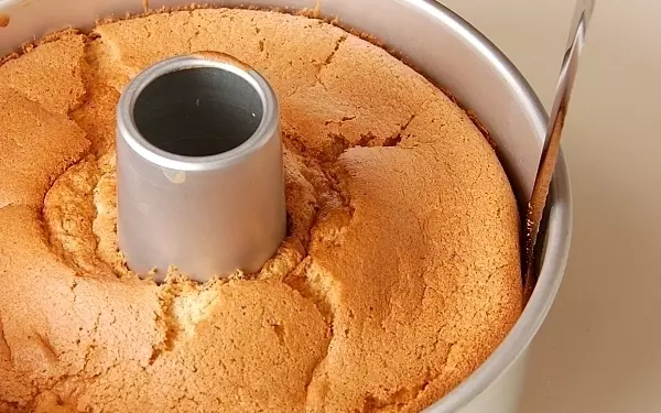 9、焼き上がれば、ビン等に型をひっくり返して逆さまにして、完全に冷めれば、型と生地の間にナイフを差し込み、型の縁に添ってナイフを移動しながら型から外し、中央の筒部分、底部分も同様に外す。