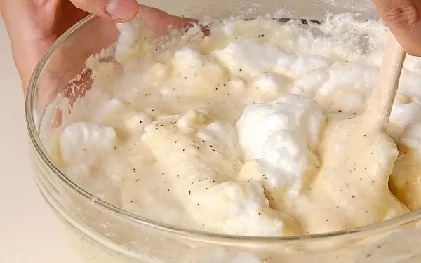 6、全体に混ざれば、残りのメレンゲを加えゴムベラで空気を入れないように、ゴムベラでボウルの底をこすりながら切るように混ぜる。