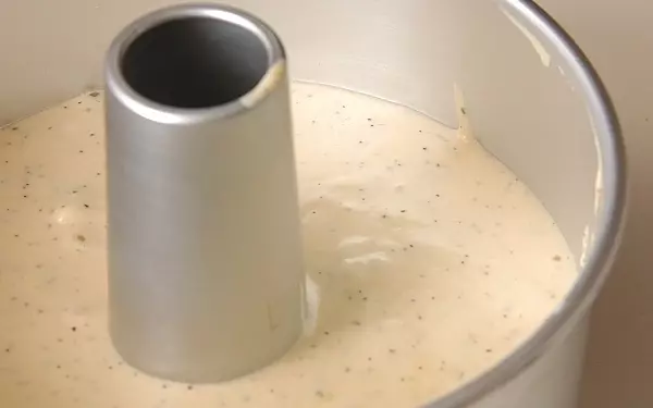 7、何も塗っていないシフォン型に6の生地を少し高い位置(型から20cm位上)から流し入れ、型を台にトントンと落として、生地の中の大きな空気を抜き、天板にのせ予熱したオーブンの下段に入れ40分焼く。