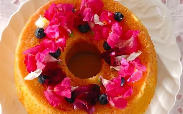 子どもが大好きなふわふわの米粉入りのシフォンケーキ。誕生日や記念日などは、アイシングやデコレーションで、華やかに。エディブルフラワーという、食べられる花を飾ると、豪華さが格段にアップします。