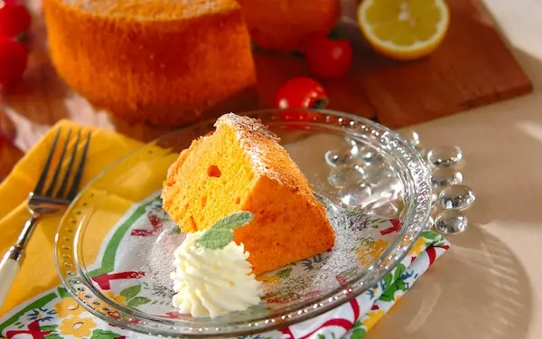 野菜スイーツを作りたくなったら、こちらのレシピを試してみませんか? ほんのりトマトの香りが広がる、ヘルシーなシフォンケーキです。器に盛って粉砂糖を振ってから、レモンクリームを絞り、ミントの葉を飾ってくださいね。