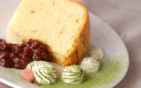 春に味わいたいシフォンケーキです。仕上げに好みで、ホイップクリームと缶あずきを添え、抹茶を茶こしに入れ振りかけてくださいね。桜のシーズンであれば、塩漬けの桜の花を飾るのもいいでしょう。