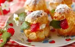 イチゴジャムとイチゴのリキュールが入った、ふんわりとしたケーキ。仕上げに、ホイップクリームとイチゴを添えてミントの葉を飾りましょう。お好みで、イチゴリキュールをかけても美味しいです。