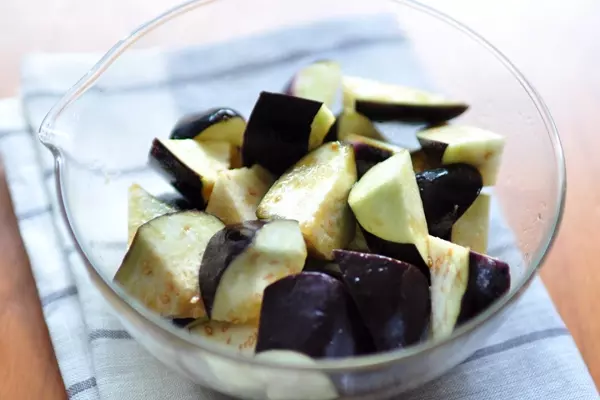 1.なすはへたを切り落とし、小さめの乱切りにする。