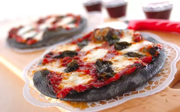 ナポリ風ピッツァの代表格「マルゲリータ」に炭パウダーを加えてアレンジ。真っ黒なピザ生地にトマトソースモッツアレラチーズ、バジルをトッピングします。見た目のインパクト大ですが、味はとっても美味。おもてなしレシピとしても活躍してくれそうですね。