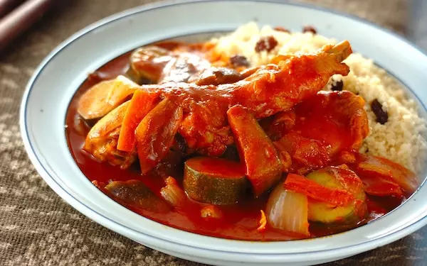 モロッコやチュニジアなど北アフリカが起源のクスクスですが、今ではシチリアなどの伝統食になっています。スパイシーなスープとクスクスのコラボレーションはたまらない美味しさ。辛いのが好きな場合は、ハリサとオリーブ油を同量混ぜ合わせ、食べるとに辛さを調整しながら加えてください。