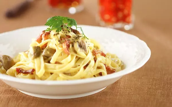 カリカリに焼いたベーコンが味の決め手の濃厚なカルボナーラです。味をひきしめる黒コショウが炭灰に見えることから「カルボナーラ(炭焼き風)」という名前になったそう。パスタはソースがからみやすいフェットチーネでいただきましょう。