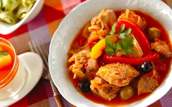 鶏肉をたっぷりのパプリカと一緒に煮込みます。作っておけるのでおもてなしにも便利です。水煮トマトがホールの場合は、手でつぶしながら加えてくださいね。イタリアンレストランの味を自宅で再現できますよ。