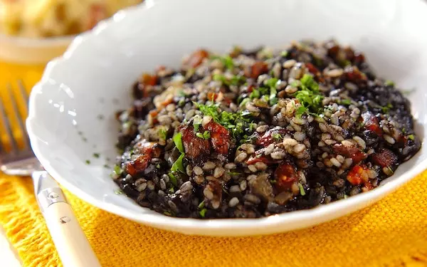 なんとヴェネチアでは、パスタよりも米料理の方がポピュラーなのだそうです。ヴェネツィアの代表的な料理「イカスミリゾット」は、そんなヴェネチアの風が感じられる一皿。最後に、イタリアンパセリを散らしてからいただきましょう。トマトの酸味がアクセントになり、あっという間に完食してしまいますよ。
