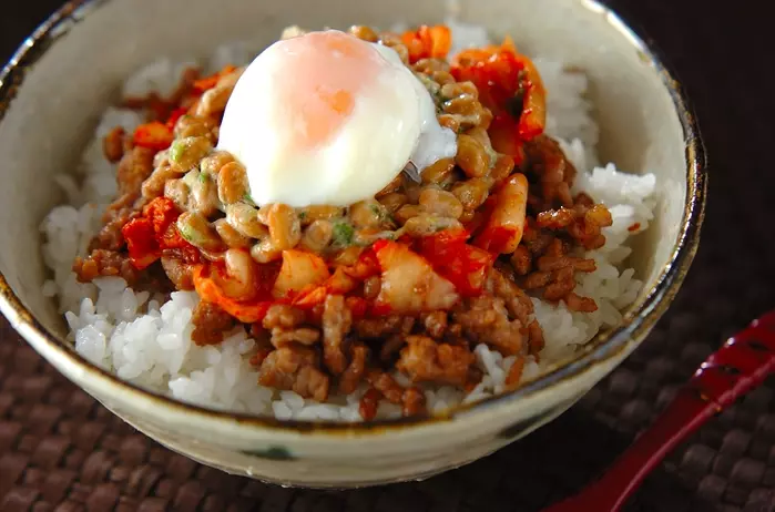 納豆とキムチの発酵食品同士にひき肉をプラスして食べ応えアップ。温泉卵を崩しながら食べると美味。