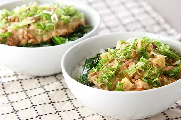 マヨネーズ・ツナ・納豆の新鮮な組み合わせ。炒めたニラとワカメが入たカフェ風ボウル。しかも栄養価が高い丼です。