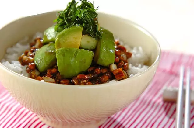 美肌食材のサーモンとアボカドに、さらに免疫力アップの納豆を合わせたカフェ風丼。食べ応えがある上に体の中から美しくなれるおしゃれ丼です。