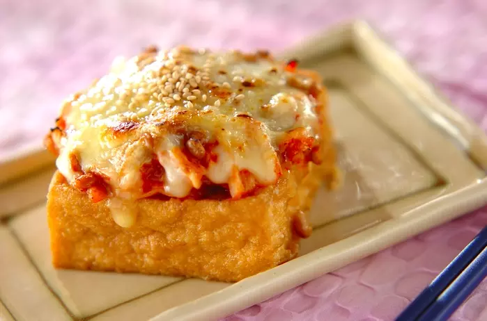 納豆・キムチ・チーズ全て発酵食品で作る厚揚げのチーズ焼き。包丁を使わずトースターやグリルで簡単に作れる嬉しいレシピです。