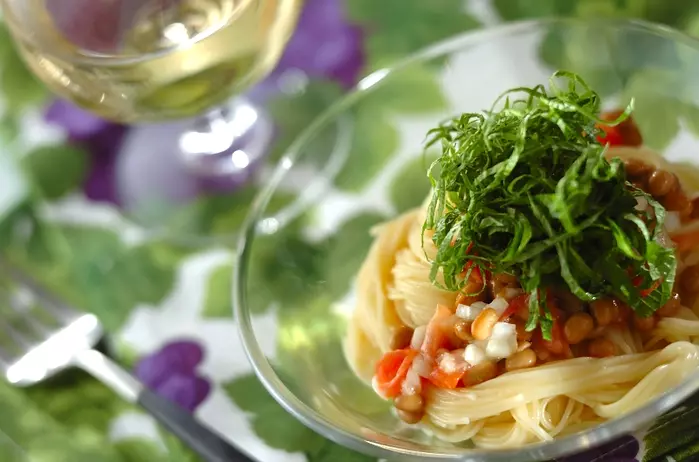 極細パスタのカッペリーニに納豆と塩トマトを合わせた清涼感あふれる一品は、カッペリーニだけでなく、稲庭うどんや素麺などの細麺にあいます。