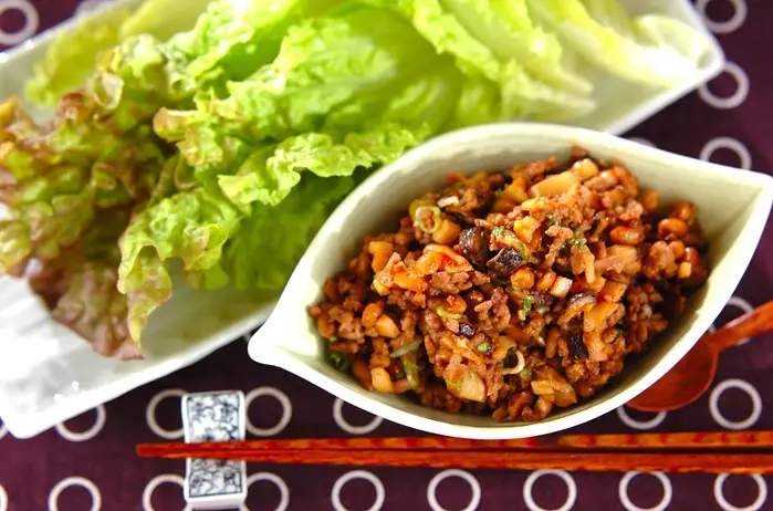納豆とひき肉、水煮タケノコなどをみそベースのタレで炒めたものをレタス包みにするとこんなに華やかな一皿に。納豆の粒を潰さないよう優しく炒めるのがポイントです。