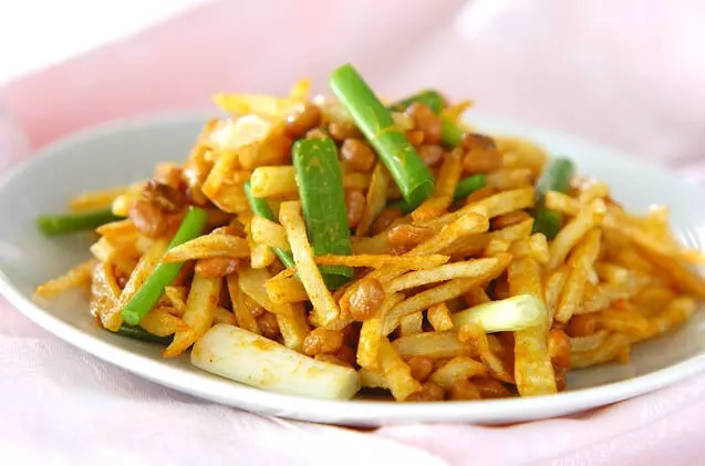 少し多めの油で揚げるように炒めたカレー風味のジャガイモに納豆を合わせました。カレーの風味で納豆の独自の香りが飛ぶので納豆が苦手なお子さんでも食べられそう。カレー味は納豆と意外とよく合います。食パンにのせてトーストしてもおいしいですよ。