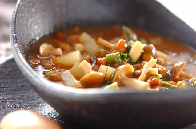 納豆、シメジ、レンコン、こんにゃくなど具沢山の食べる味噌汁。ナメコと納豆のヌルヌルパワーで体の中からきれいになりましょう。