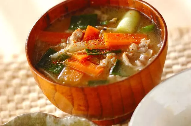 根菜を使うことの多い豚汁ですが、夏野菜でもおいしくいただけます。夏場、食欲のない時や冷房で冷えた体にやさしい豚汁です。ミョウガのさっぱりとした味わいが豚汁と良く合います。
